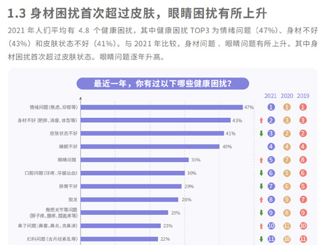 第二,在各類健康困擾中,人們對身材的關(guān)注首次超過皮膚,排名第二,這其中主要是肥胖相關(guān)的身材困擾。