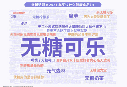 第三,2021的食品熱詞是“無糖飲料”,人們提到買得最多的品類是無糖飲料。而很多人開始選擇“無糖飲料”,其實也跟身材困擾有關(guān),不少人因為認(rèn)為“無糖飲料”能減肥、能幫助自己緩解身材困擾。