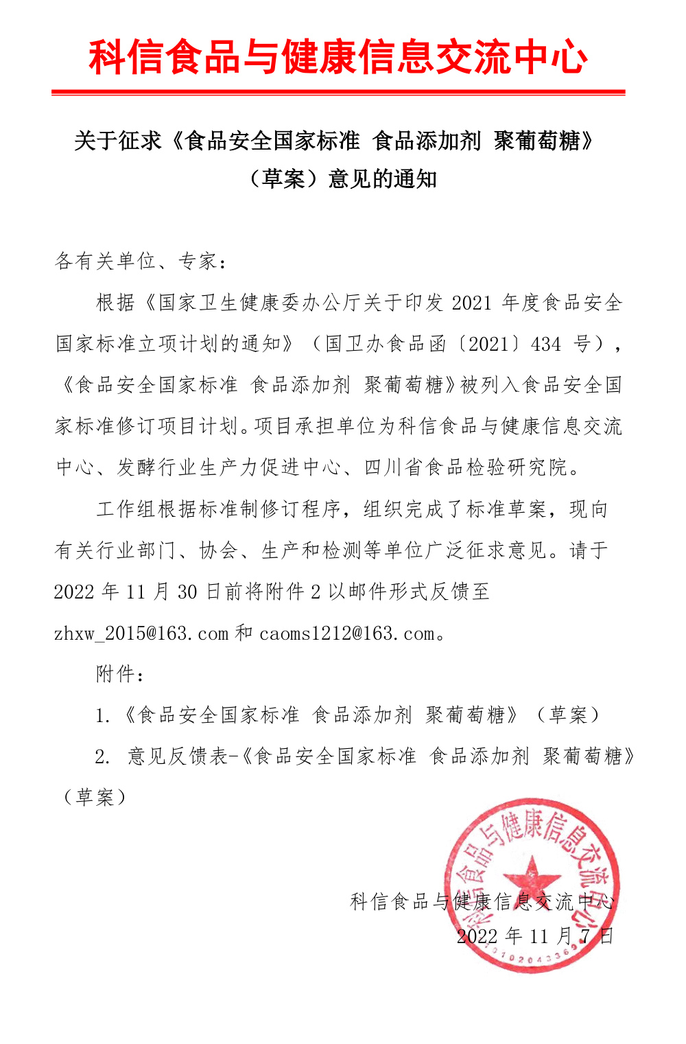 關(guān)于征求《食品安全國(guó)家標(biāo)準(zhǔn) 食品添加劑 聚葡萄糖》(草案)意見(jiàn)的通知